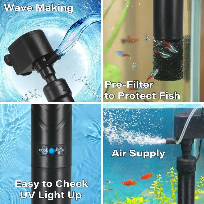 Sterilizator UV pentru acvariu Coospider – 1200 L/h, 220V, lumină UV 254nm, cu pompă de apă și oxigenare, control separat.