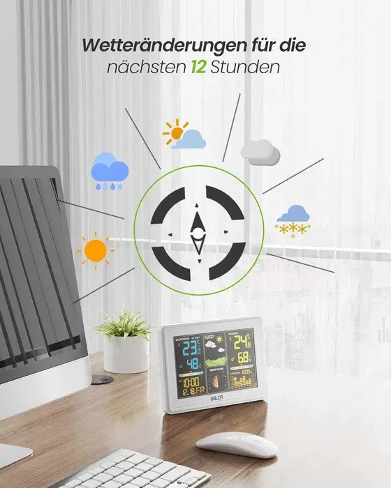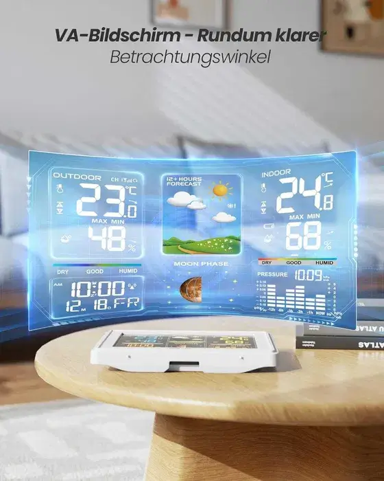 ✅ Stație meteo multifuncțională 5 în 1 – Afișează prognoza meteo (soare, parțial înnorat, noros, ploaie, ninsoare), temperatura și umiditatea interioară/exterioară, presiunea atmosferică, fazele lunii și ora exactă.